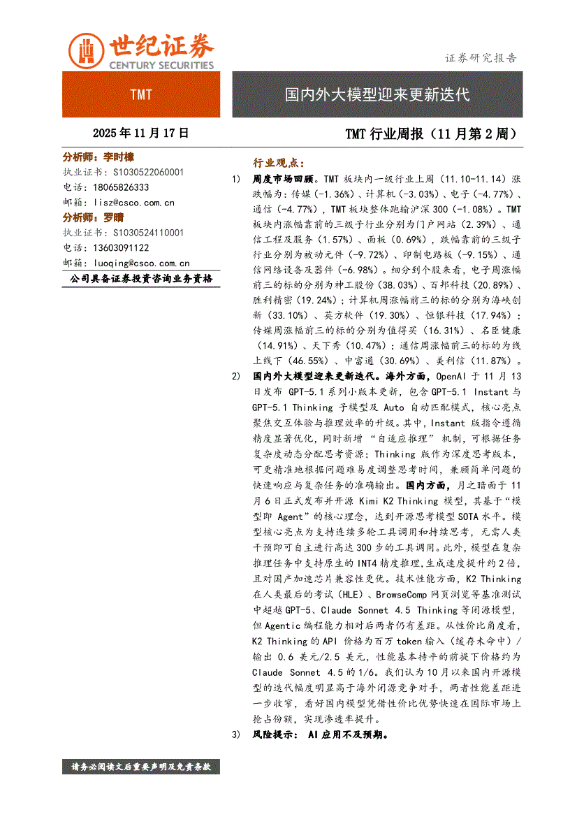 TMT行业:世纪证券-TMT行业周报(11月第2周):国内外大模型迎来更新迭代-251117