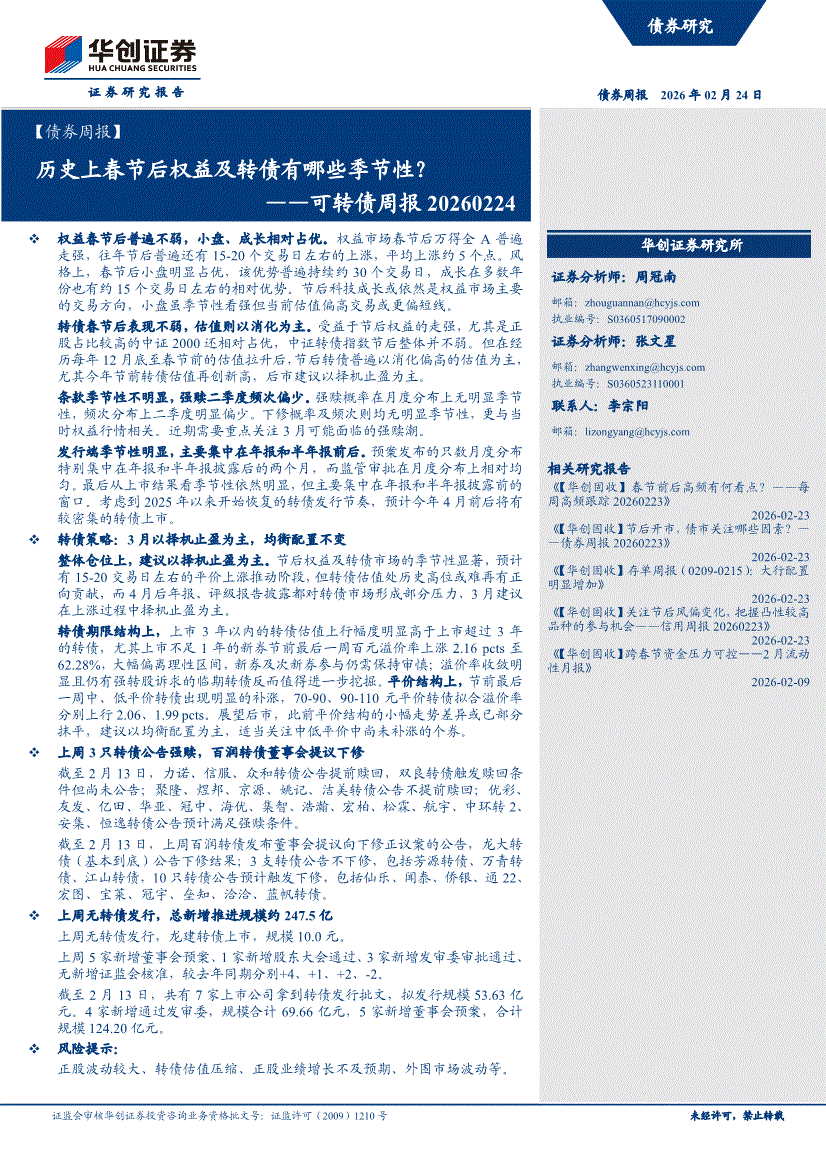 华创证券-【债券周报】可转债周报:历史上春节后权益及转债有哪些季节性?-260224
