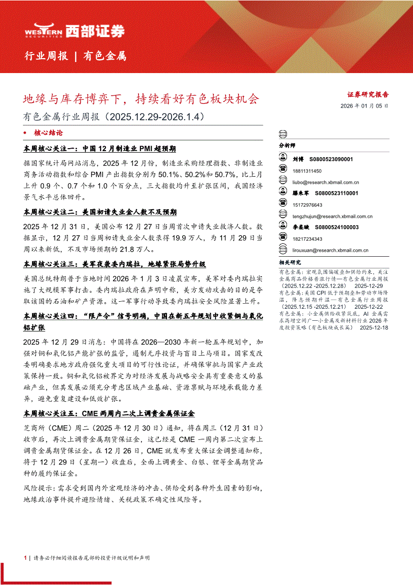 有色金属行业:西部证券-有色金属行业周报:地缘与库存博弈下,持续看好有色板块机会-260105