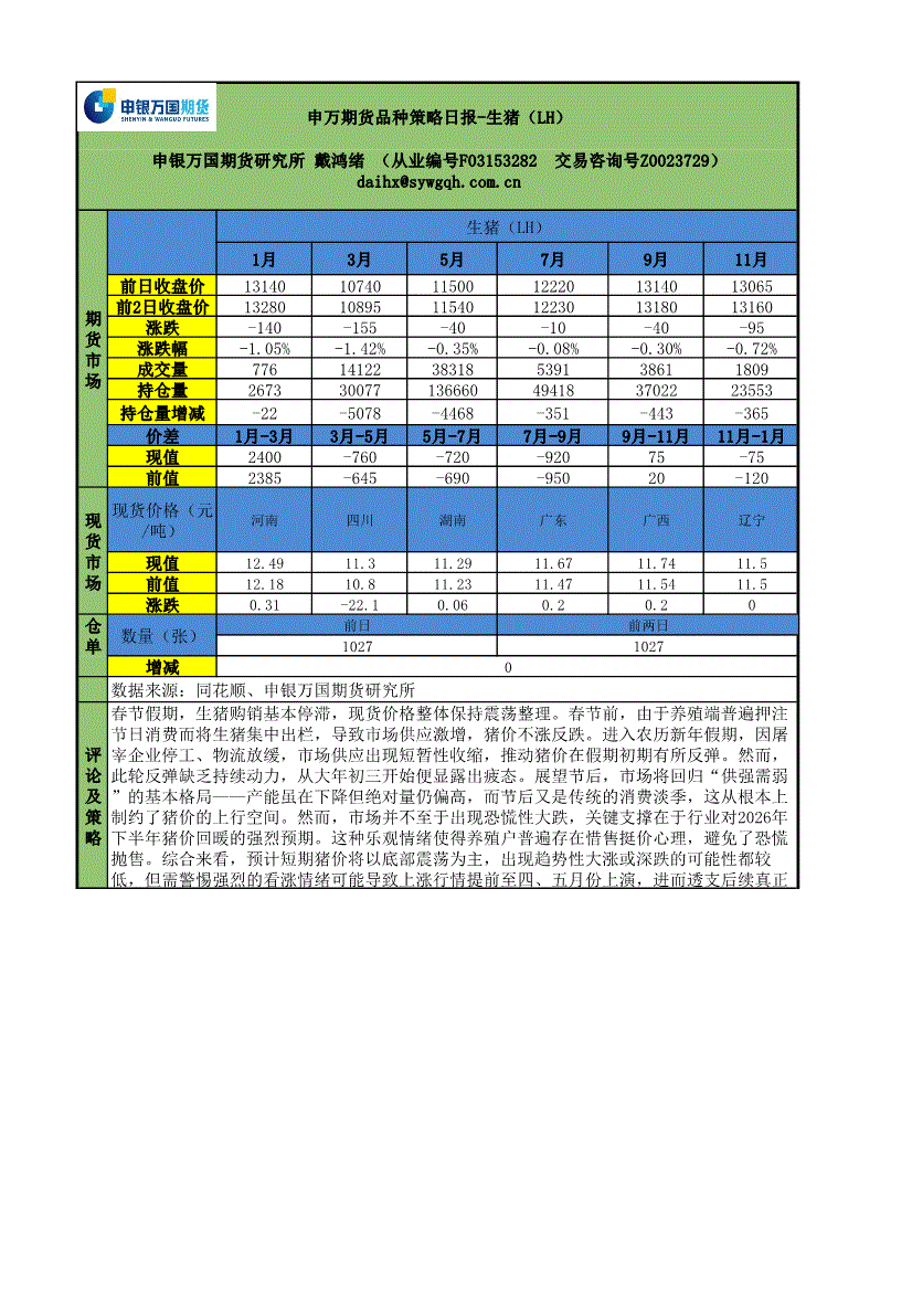 申银万国期货-品种策略日报:生猪(LH)-260211