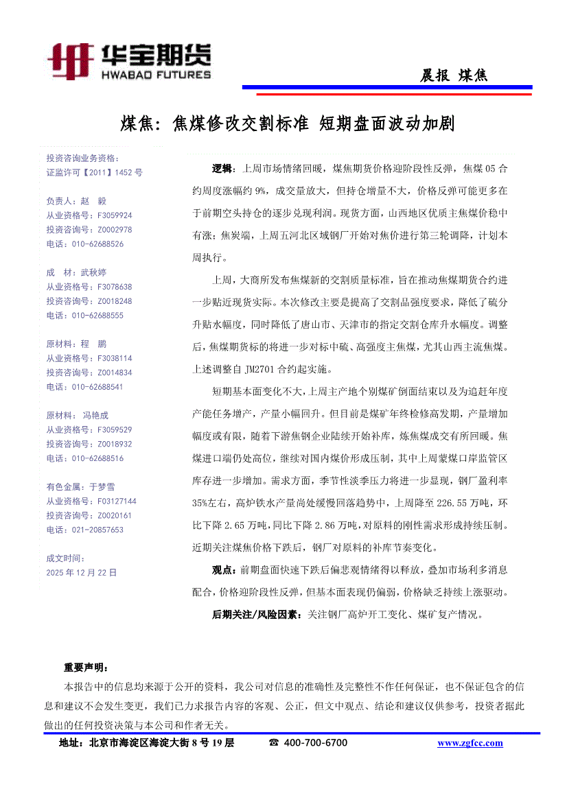 华宝期货-煤焦:焦煤修改交割标准,短期盘面波动加剧-251222