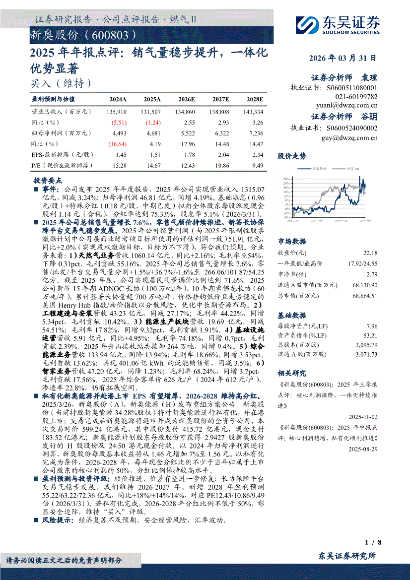 新奥股份:东吴证券-新奥股份-600803-2025年年报点评:销气量稳步提升,一体化优势显著-260331