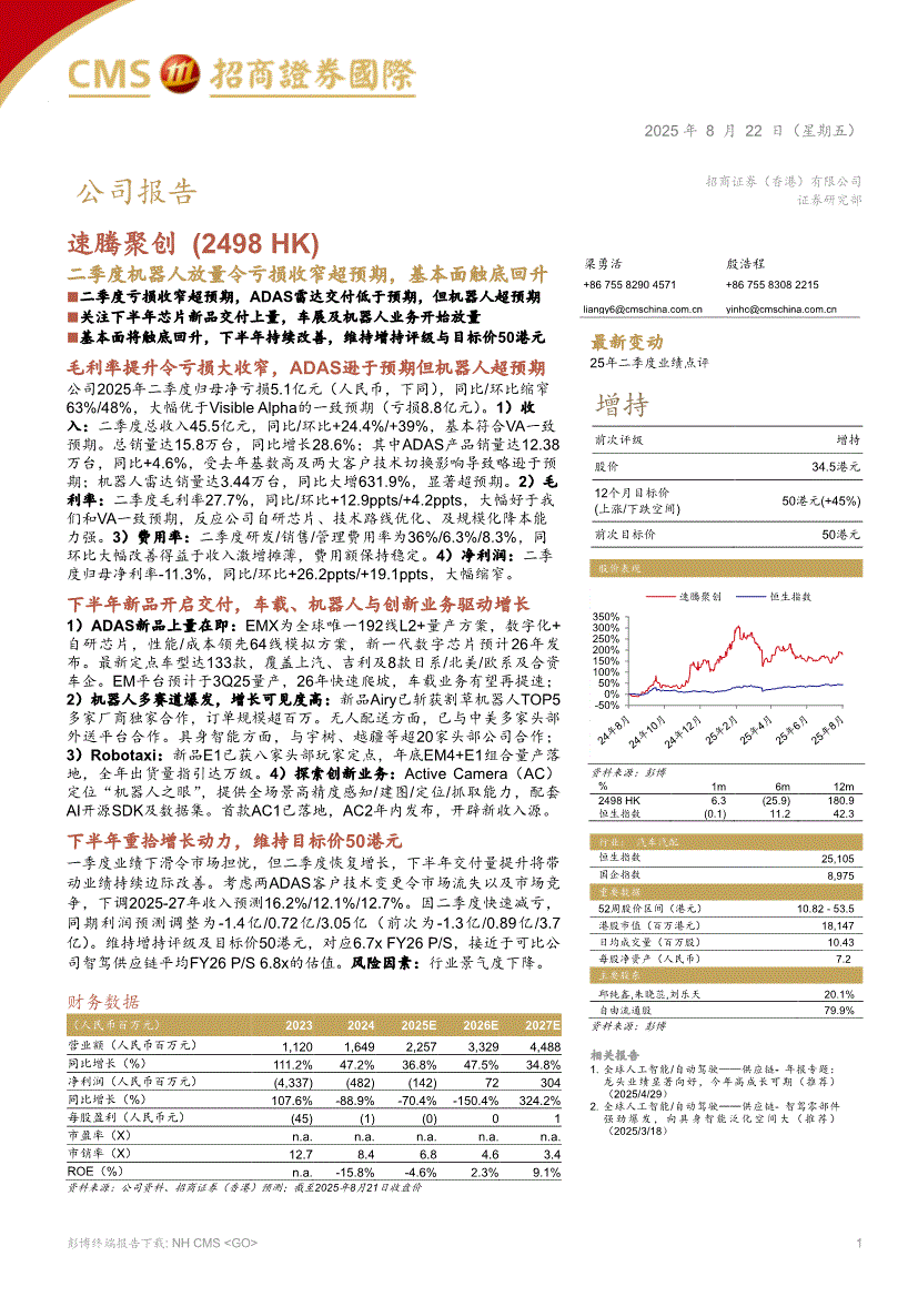 速腾聚创:招商证券(香港)-速腾聚创-2498.HK-二季度机器人放量令亏损收窄超预期,基本面触底回升-250822