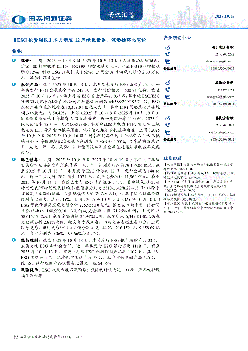 国泰海通证券-资讯汇总:【ESG投资周报】本月新发12只绿色债券,流动性环比宽松-251015