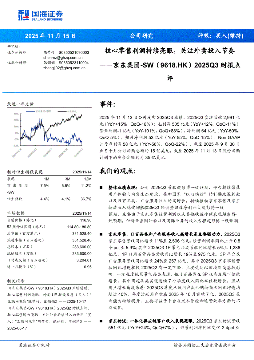 京东集团~SW:国海证券-京东集团~SW-9618.HK-2025Q3财报点评:核心零售利润持续亮眼,关注外卖投入节奏-251115