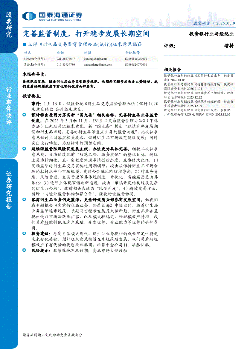 投资银行业与经纪业行业:国泰海通证券-投资银行业与经纪业行业点评《衍生品交易监督管理办法(试行)(征求意见稿)》:完善监管制度,打开稳步发展长期空间-260119