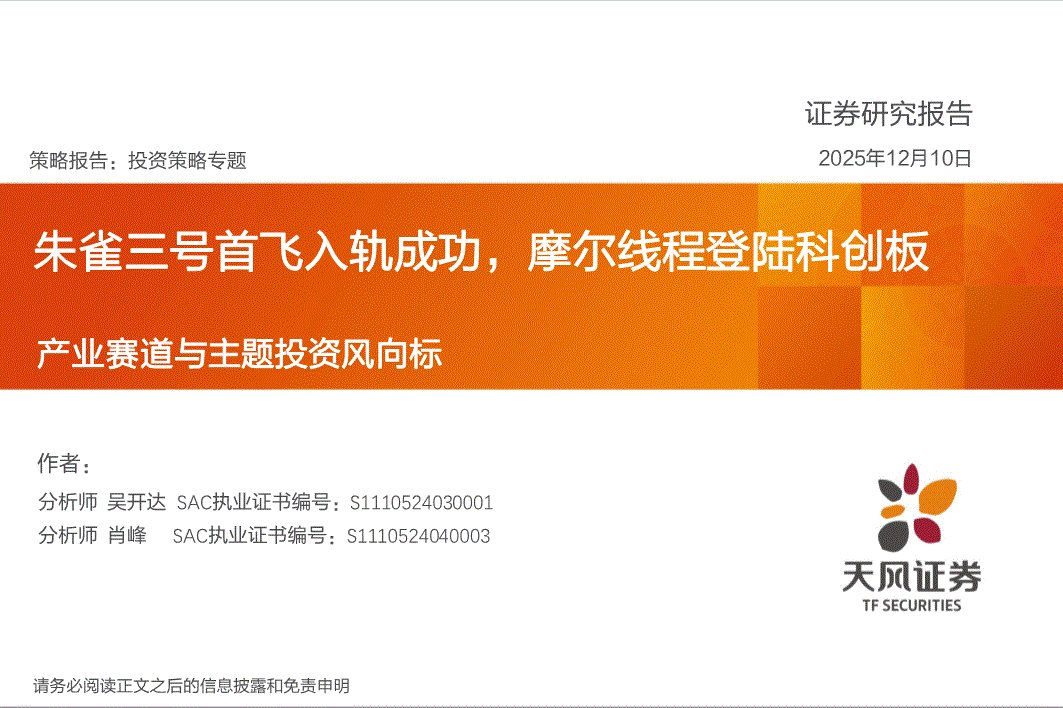天风证券-产业赛道与主题投资风向标:朱雀三号首飞入轨成功,摩尔线程登陆科创板-251210