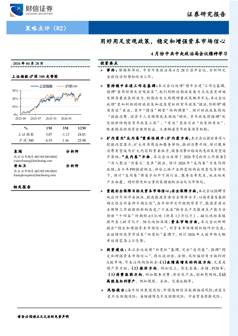 财信证券-4月份中共中央政治局会议精神学习:用好用足宏观政策,稳定和增强资本市场信心-260428