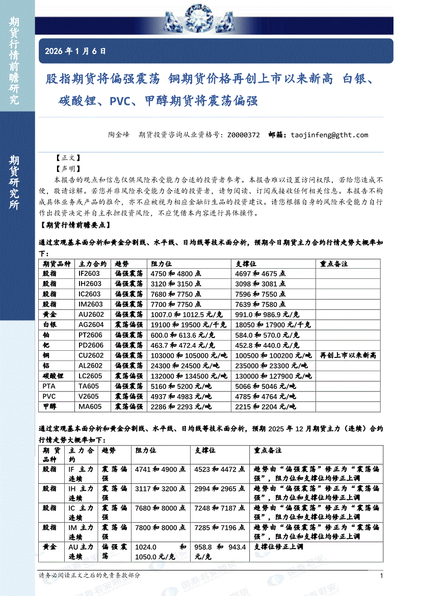 国泰君安期货-股指期货将偏强震荡,铜期货价格再创上市以来新高,白银、碳酸锂、PVC、甲醇期货将震荡偏强-260106