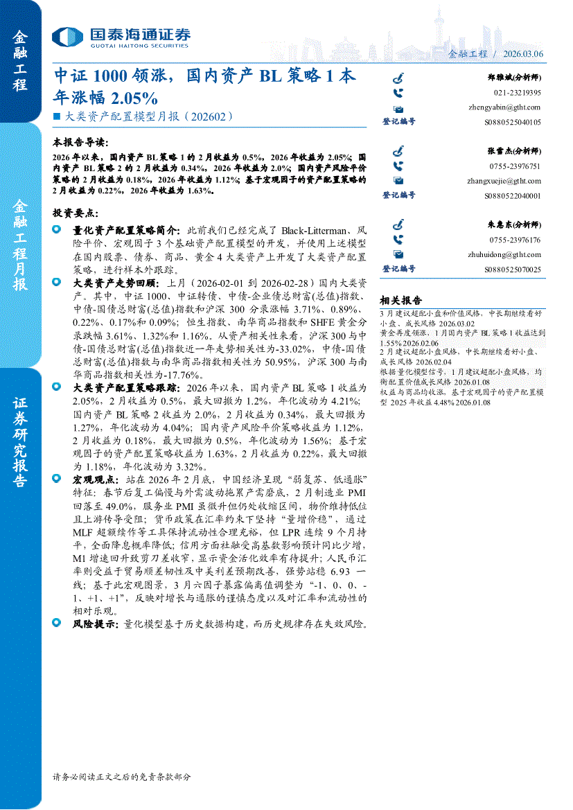 国泰海通证券-大类资产配置模型月报:中证1000领涨,国内资产BL策略1本年涨幅2.05%-260306