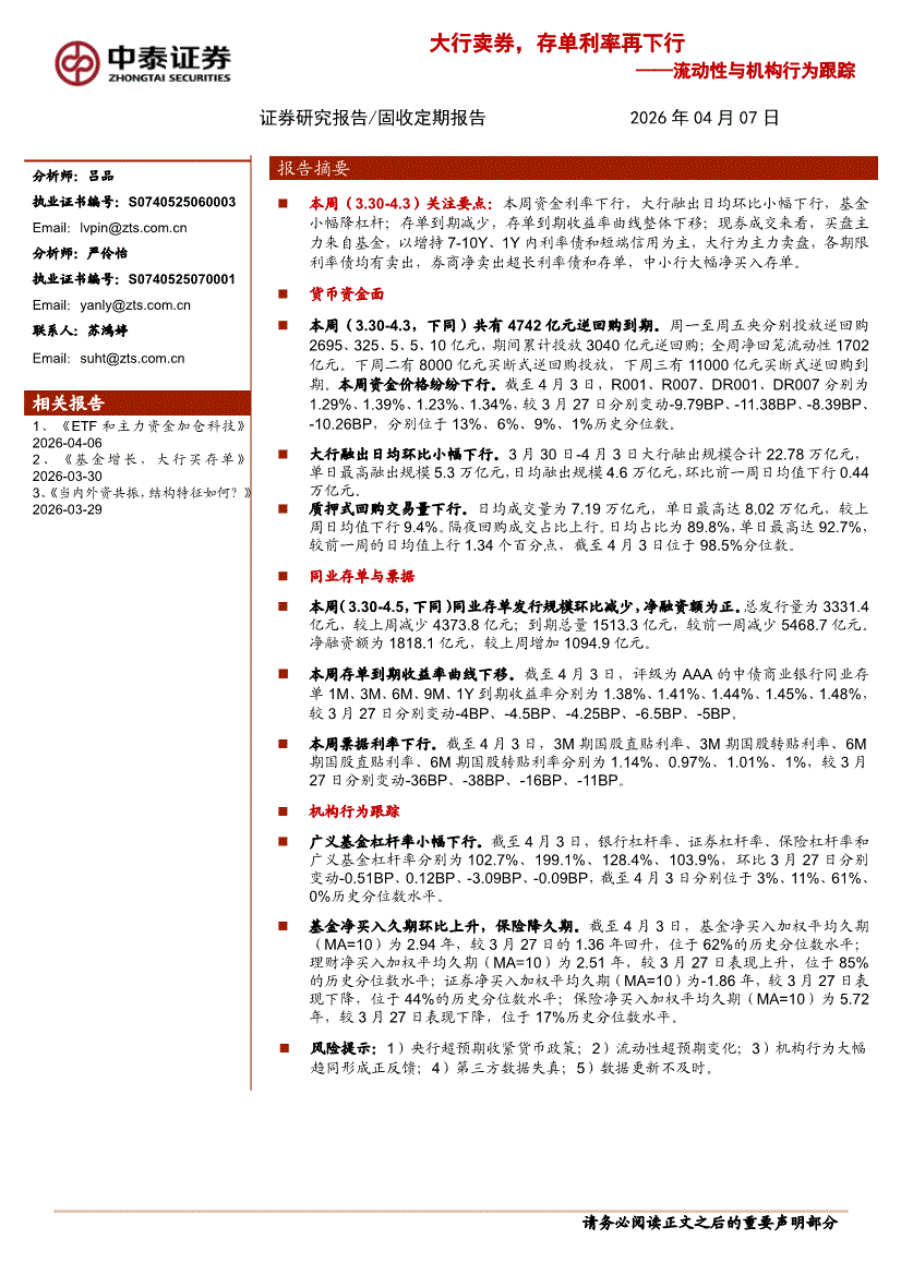 中泰证券-流动性与机构行为跟踪:大行卖券,存单利率再下行-260405