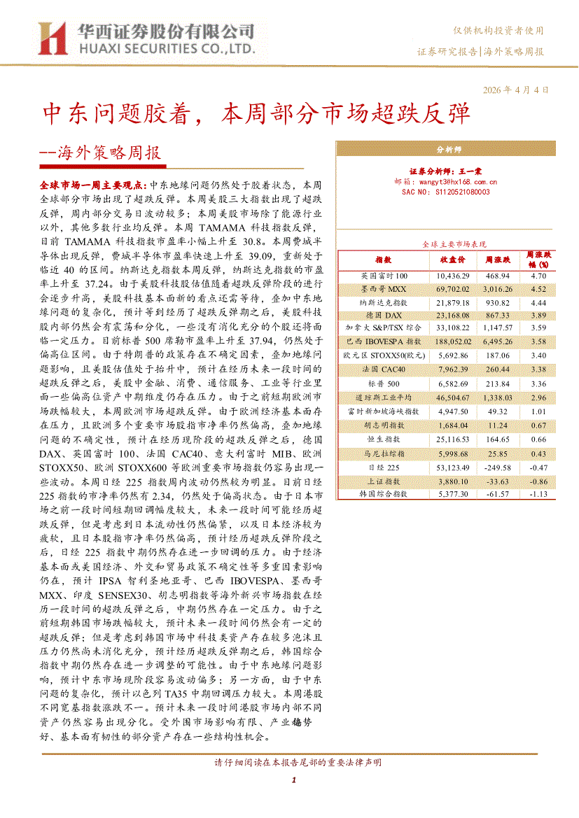 华西证券-海外策略周报:中东问题胶着,本周部分市场超跌反弹-260404
