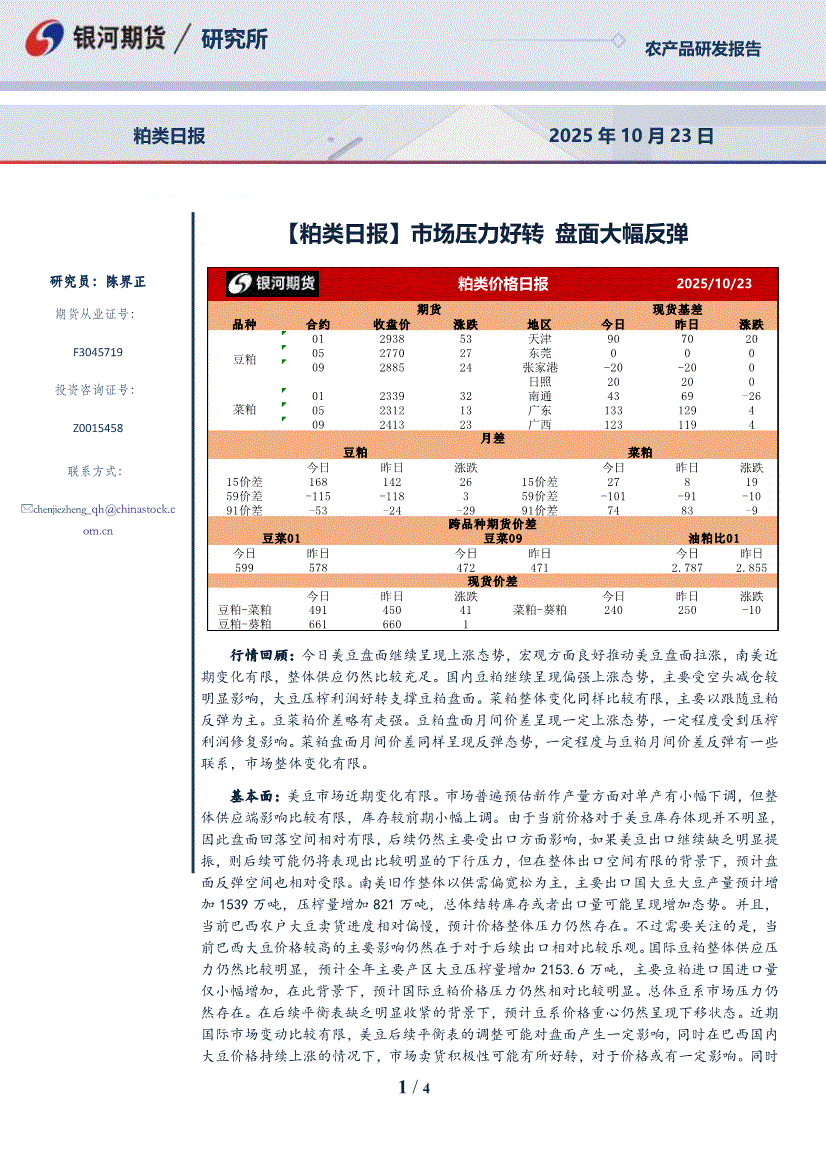 银河期货-粕类日报:市场压力好转,盘面大幅反弹-251023