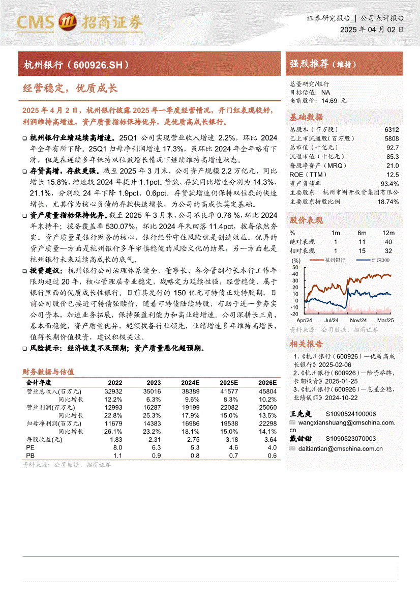 杭州银行:招商证券-杭州银行-600926-经营稳定,优质成长-250402