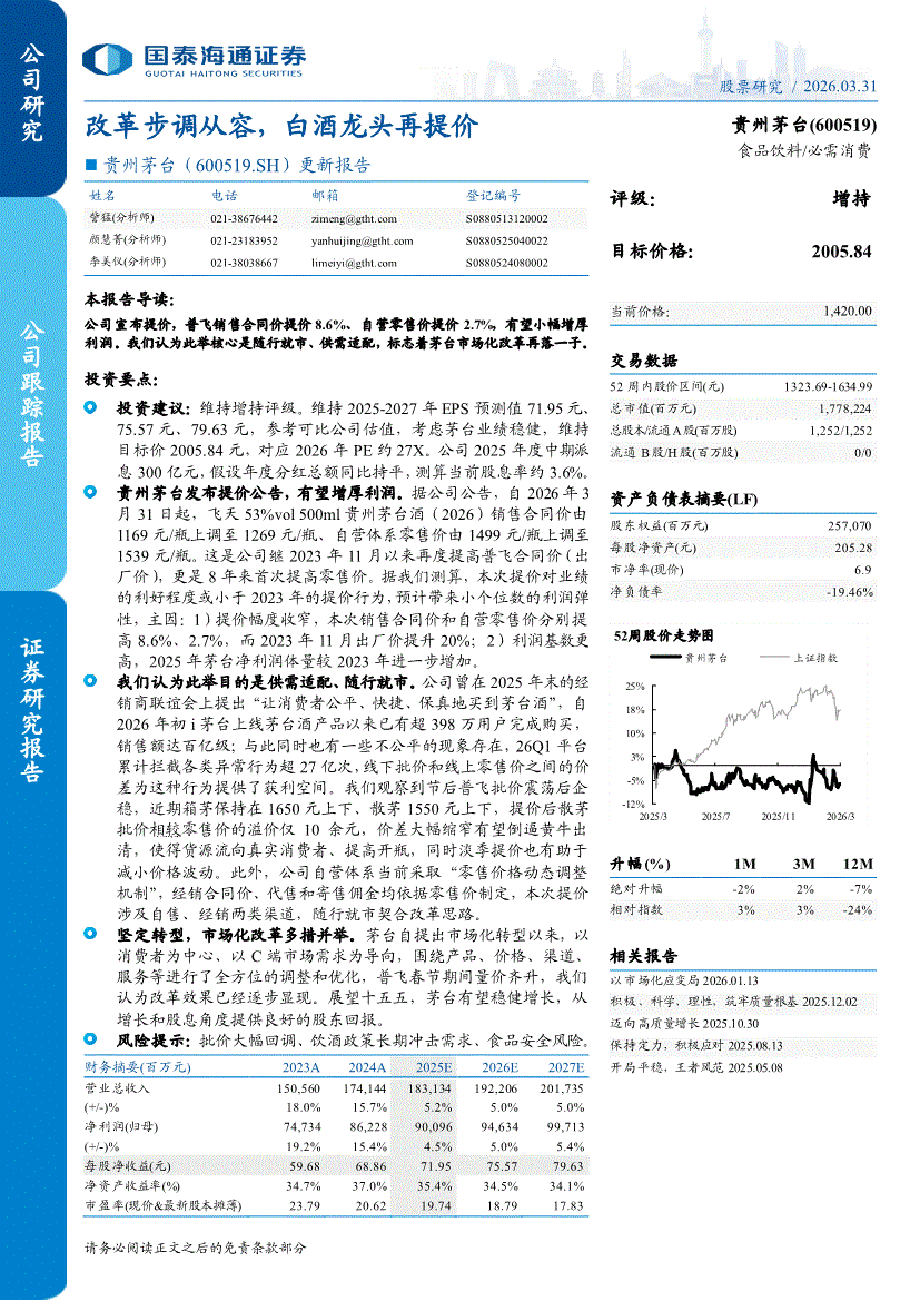 贵州茅台:国泰海通证券-贵州茅台-600519-更新报告:改革步调从容,白酒龙头再提价-260331