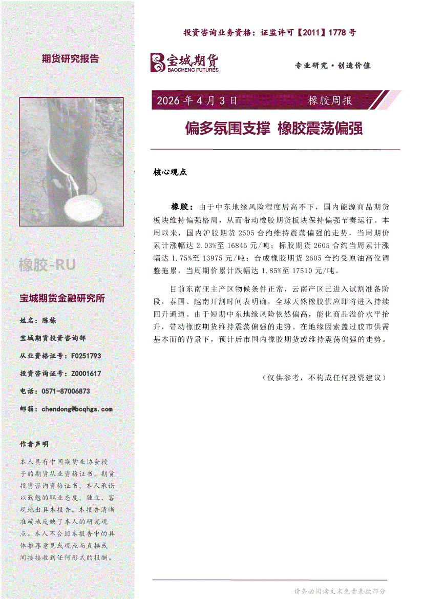 宝城期货-橡胶周报:偏多氛围支撑,橡胶震荡偏强-260403