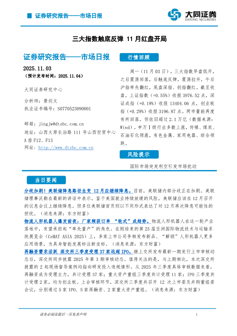 大同证券-市场日报:三大指数触底反弹,11月红盘开局-251103