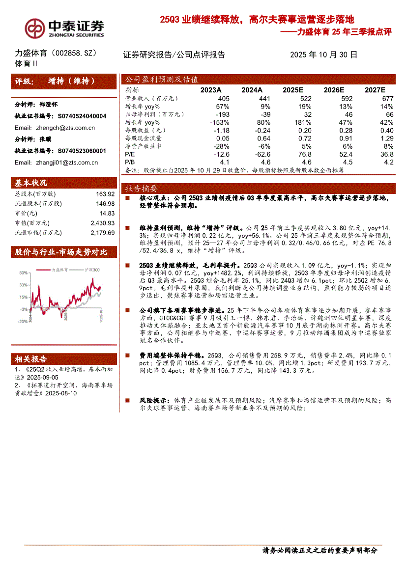 力盛体育:中泰证券-力盛体育-002858-25年三季报点评:25Q3业绩继续释放,高尔夫赛事运营逐步落地-251030