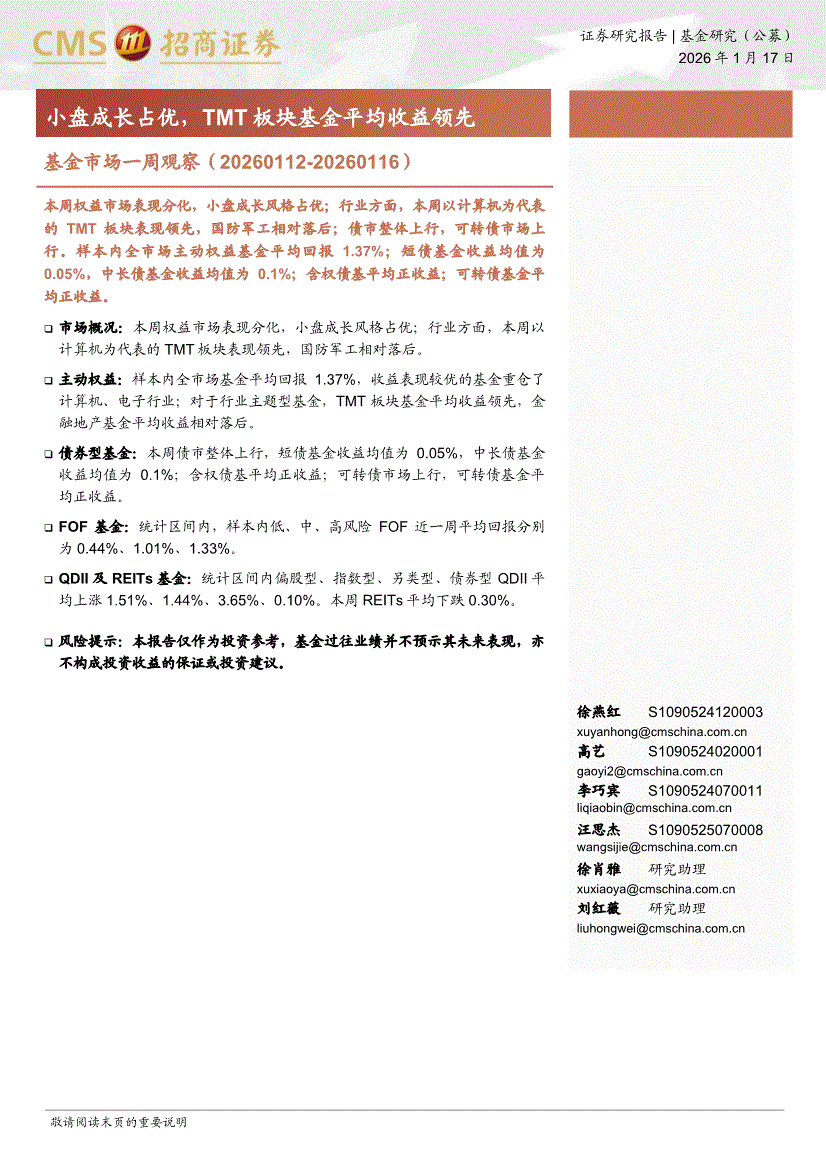 招商证券-基金市场一周观察:小盘成长占优,TMT板块基金平均收益领先-260117