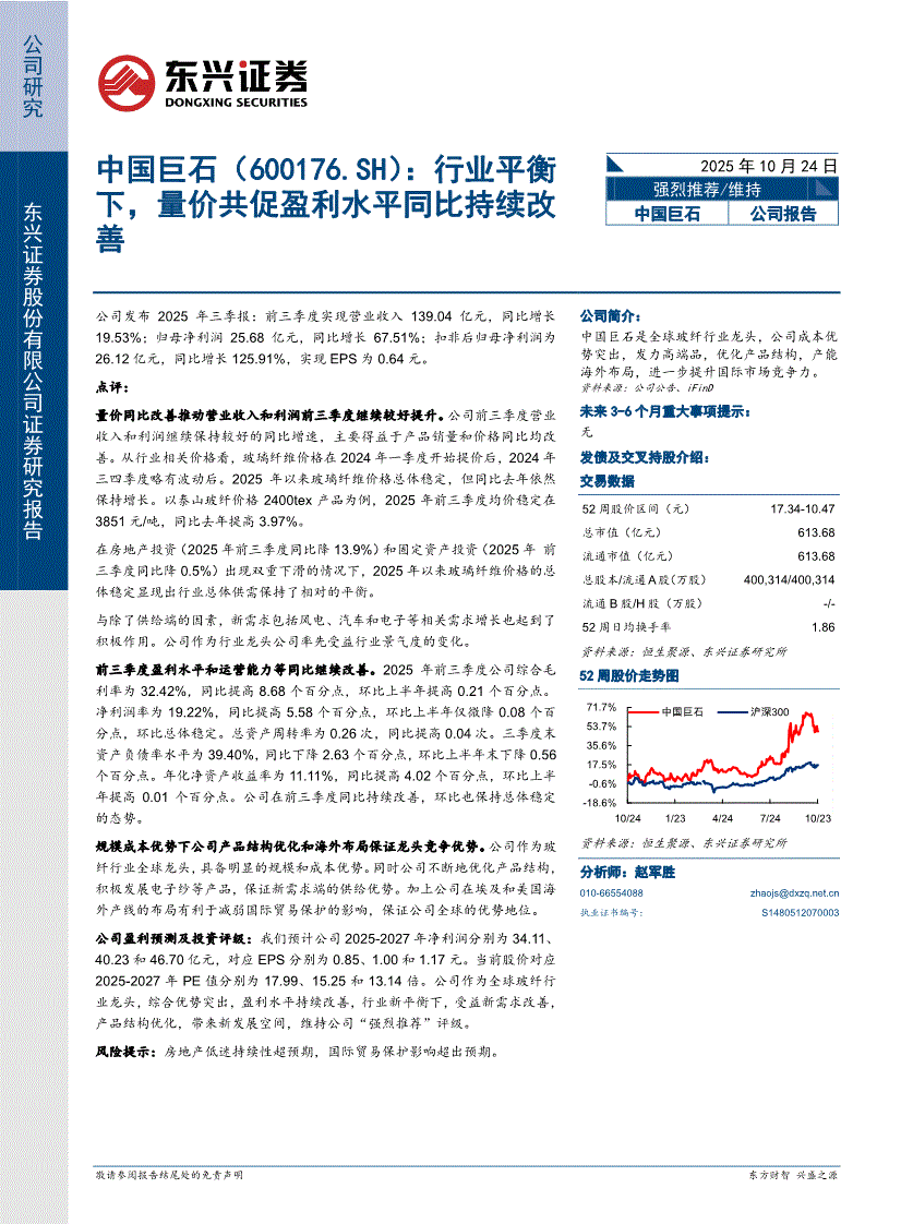 中国巨石:东兴证券-中国巨石-600176-行业平衡下,量价共促盈利水平同比持续改善-251024