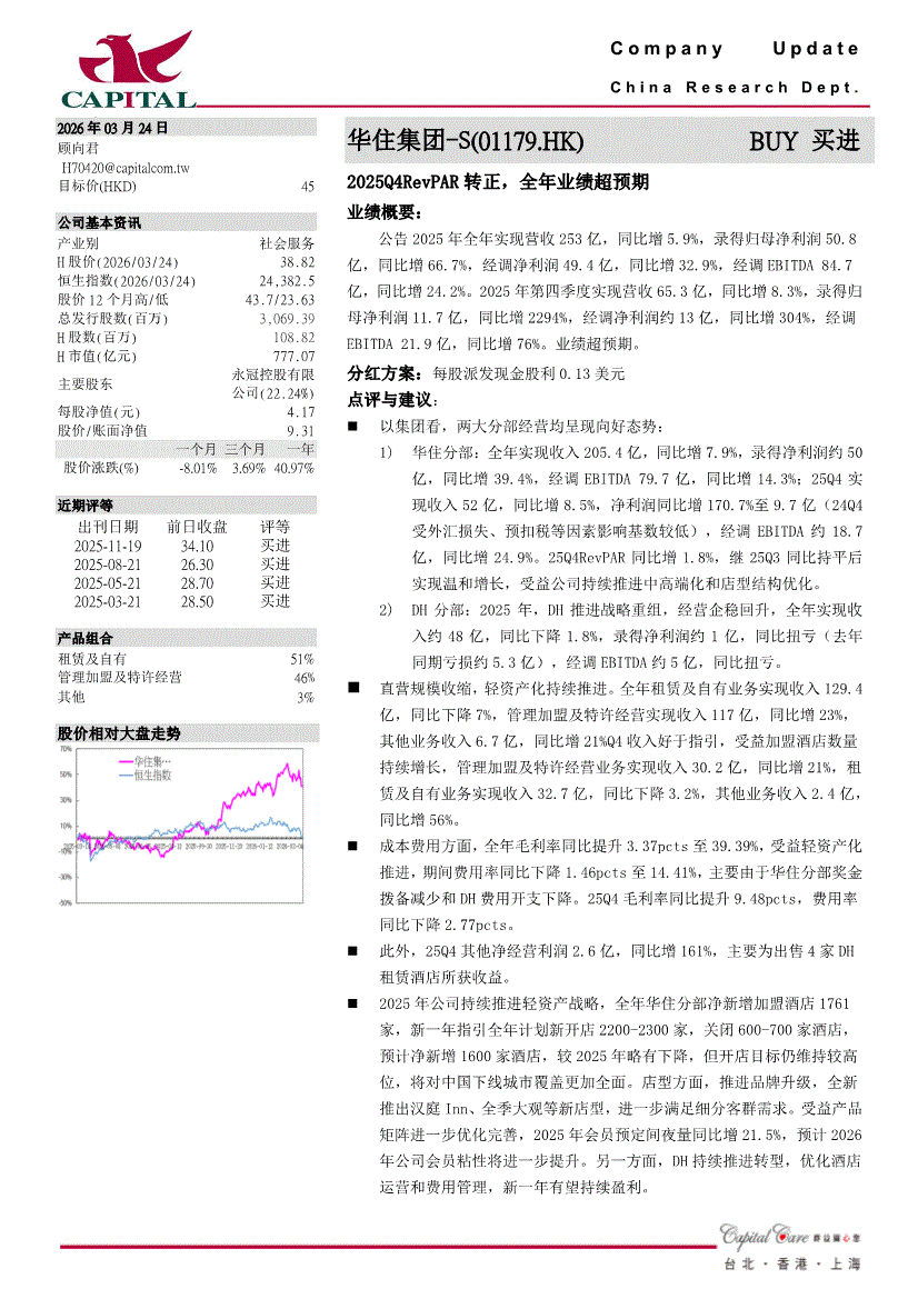 华住集团~S:群益证券(香港)-华住集团~S-1179.HK-2025Q4RevPAR转正,全年业绩超预期-260324