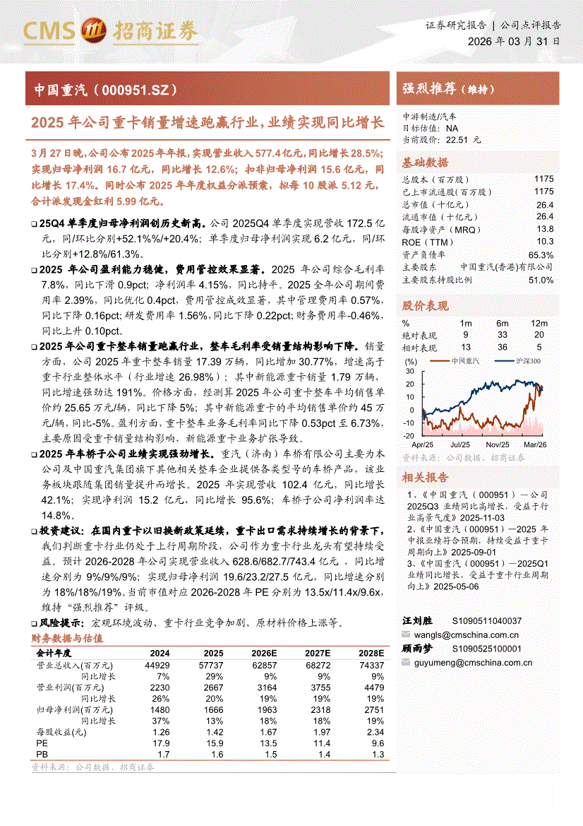 中国重汽:招商证券-中国重汽-000951-2025年公司重卡销量增速跑赢行业,业绩实现同比增长-260331