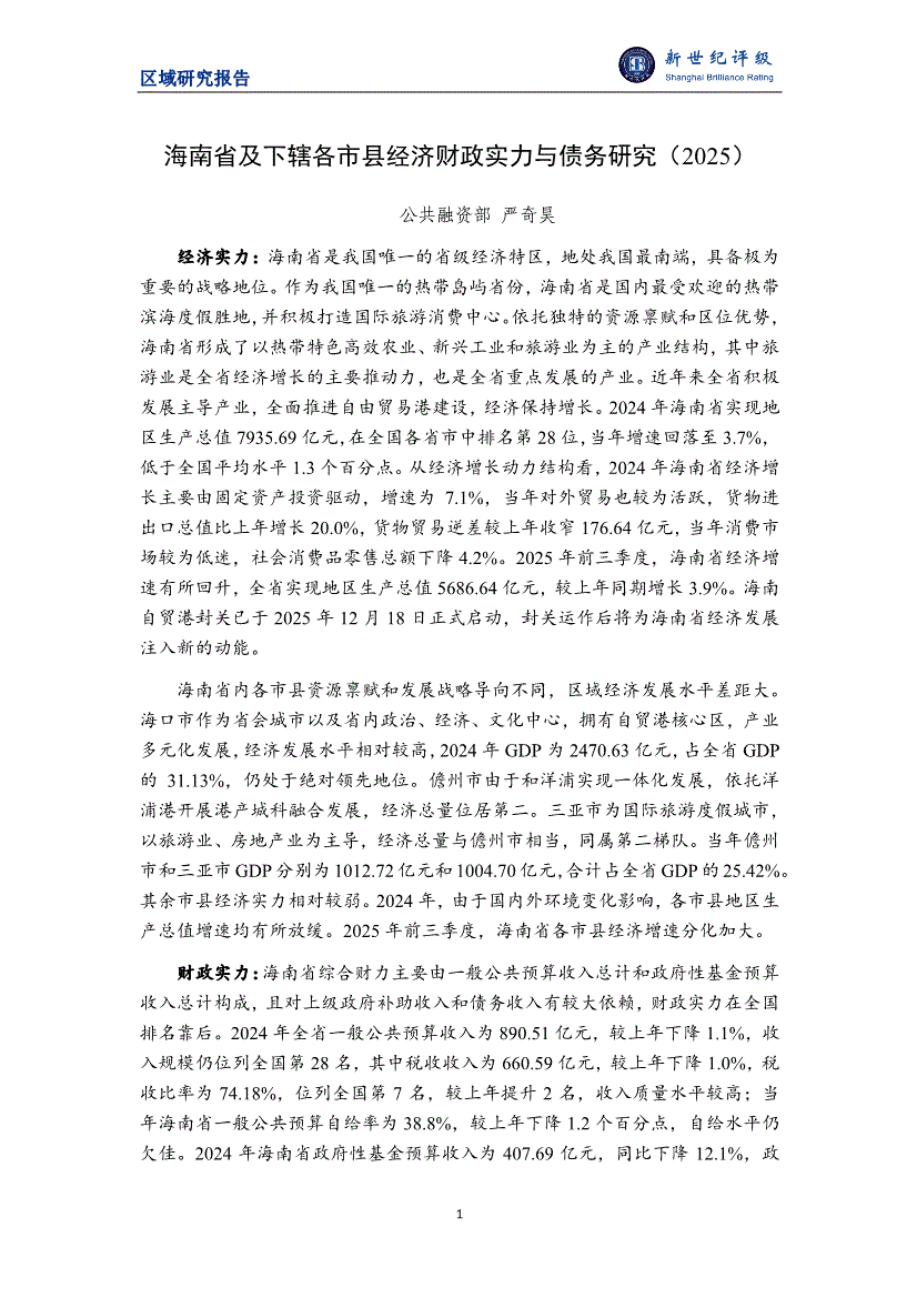 新世纪评级-海南省及下辖各市县经济财政实力与债务研究(2025)-260101