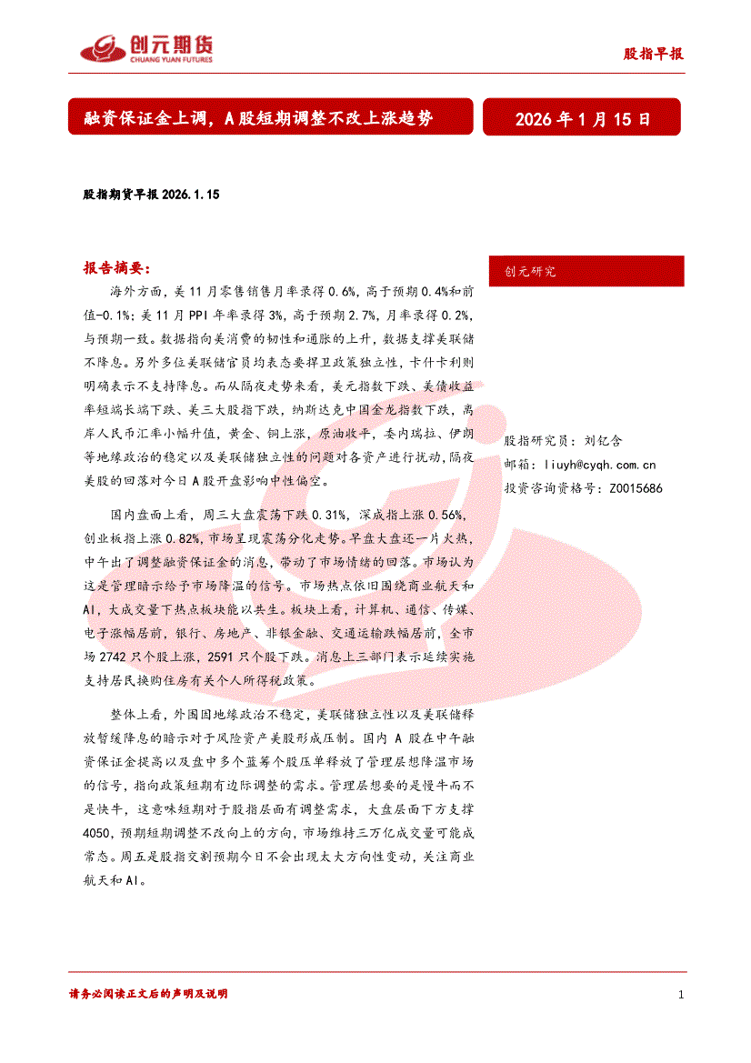 创元期货-股指期货早报:融资保证金上调,A股短期调整不改上涨趋势-260115