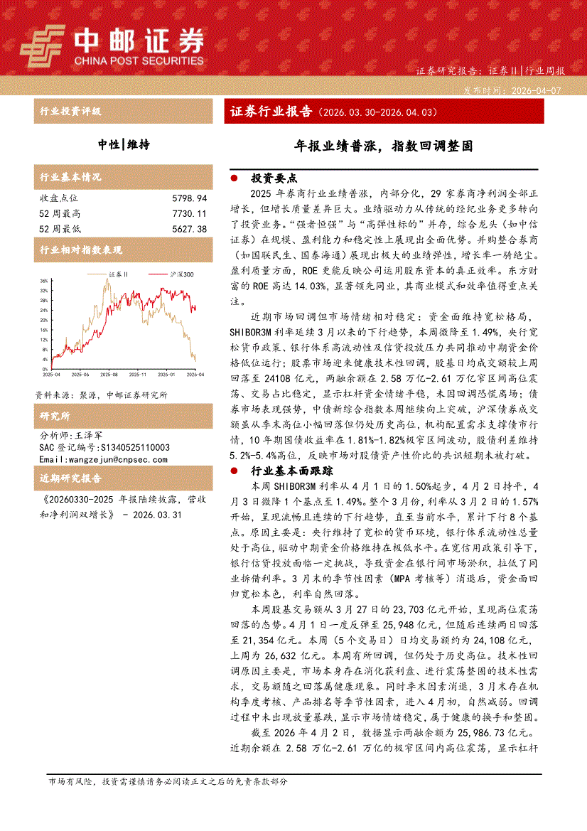 证券行业:中邮证券-证券行业周报:年报业绩普涨,指数回调整固-260407