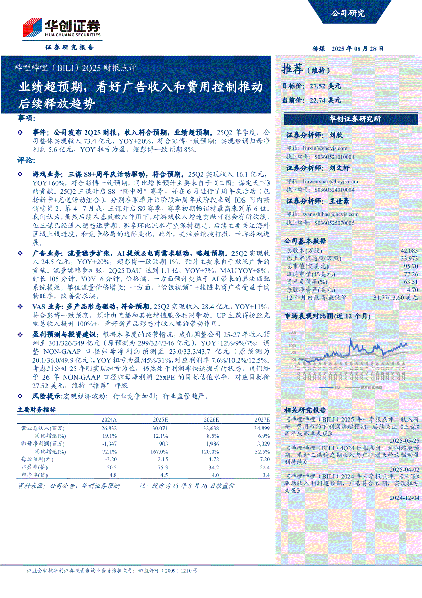 哔哩哔哩:华创证券-哔哩哔哩-BILI.US-2Q25财报点评:业绩超预期,看好广告收入和费用控制推动后续释放趋势-250828