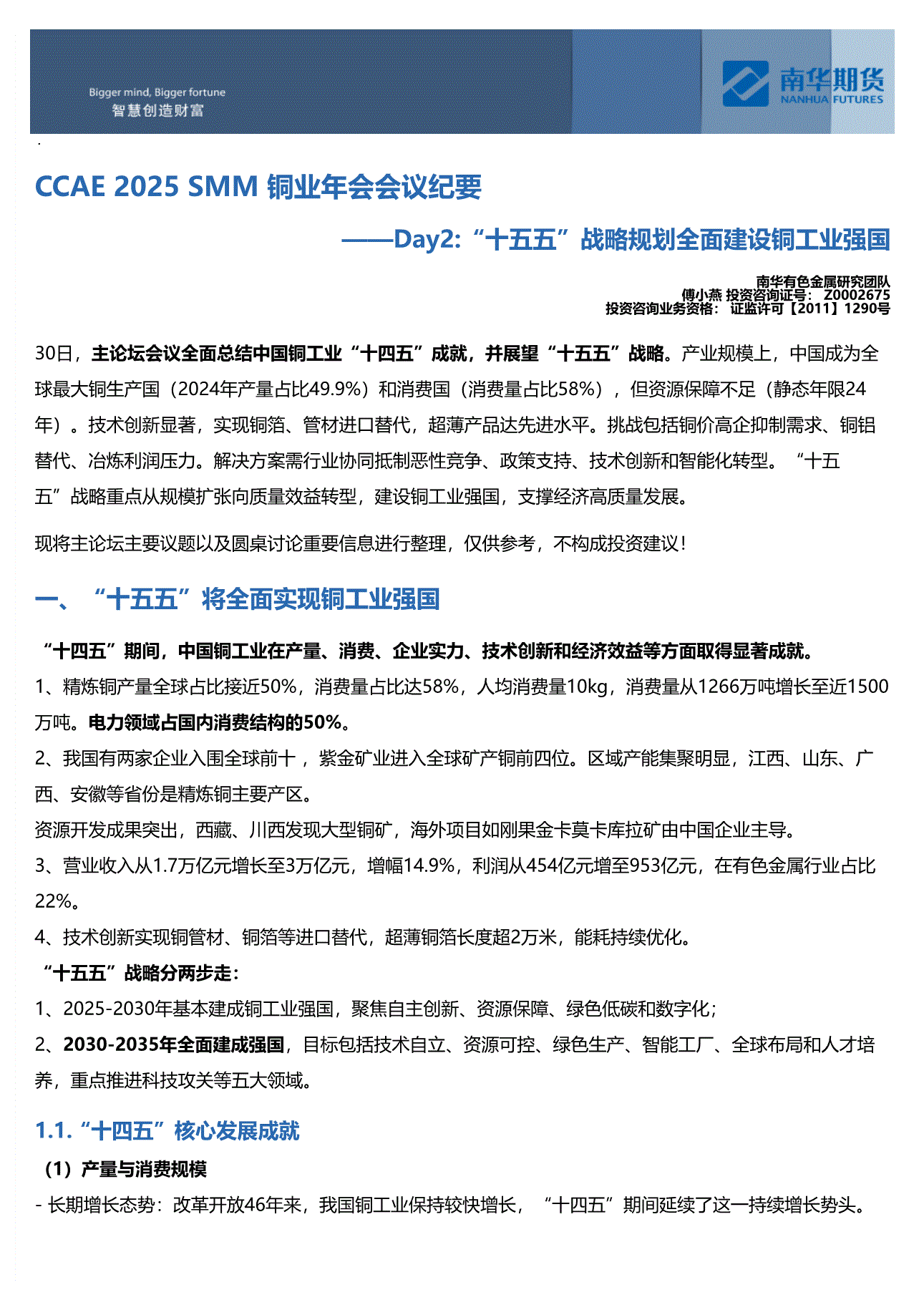 南华期货-CCAE 2025 SMM铜业年会会议纪要:Day2,“十五五”战略规划全面建设铜工业强国-251031