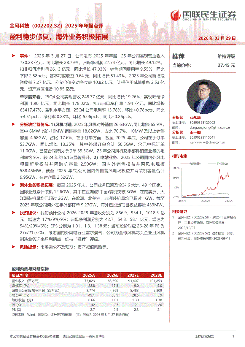 金风科技:国联民生证券-金风科技-002202-2025年年报点评:盈利稳步修复,海外业务积极拓展-260329