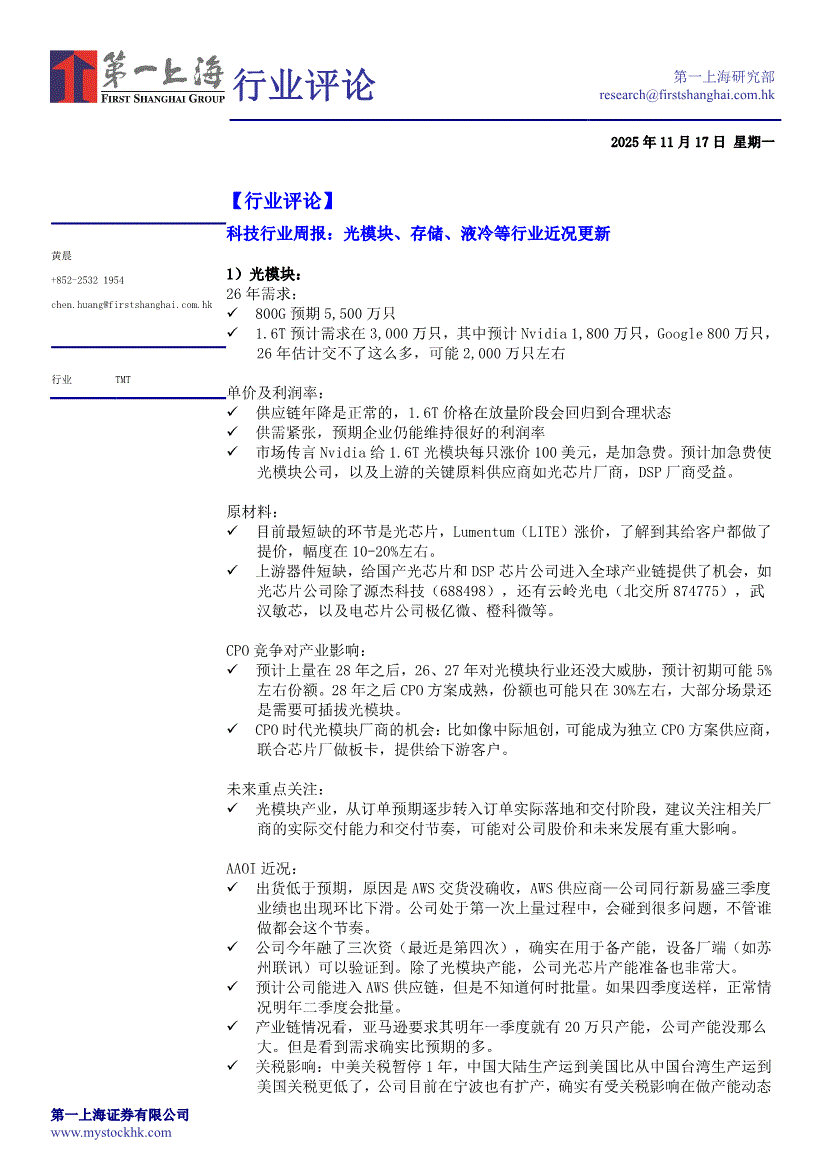 科技行业:第一上海-科技行业周报:光模块、存储、液冷等行业近况更新-251117