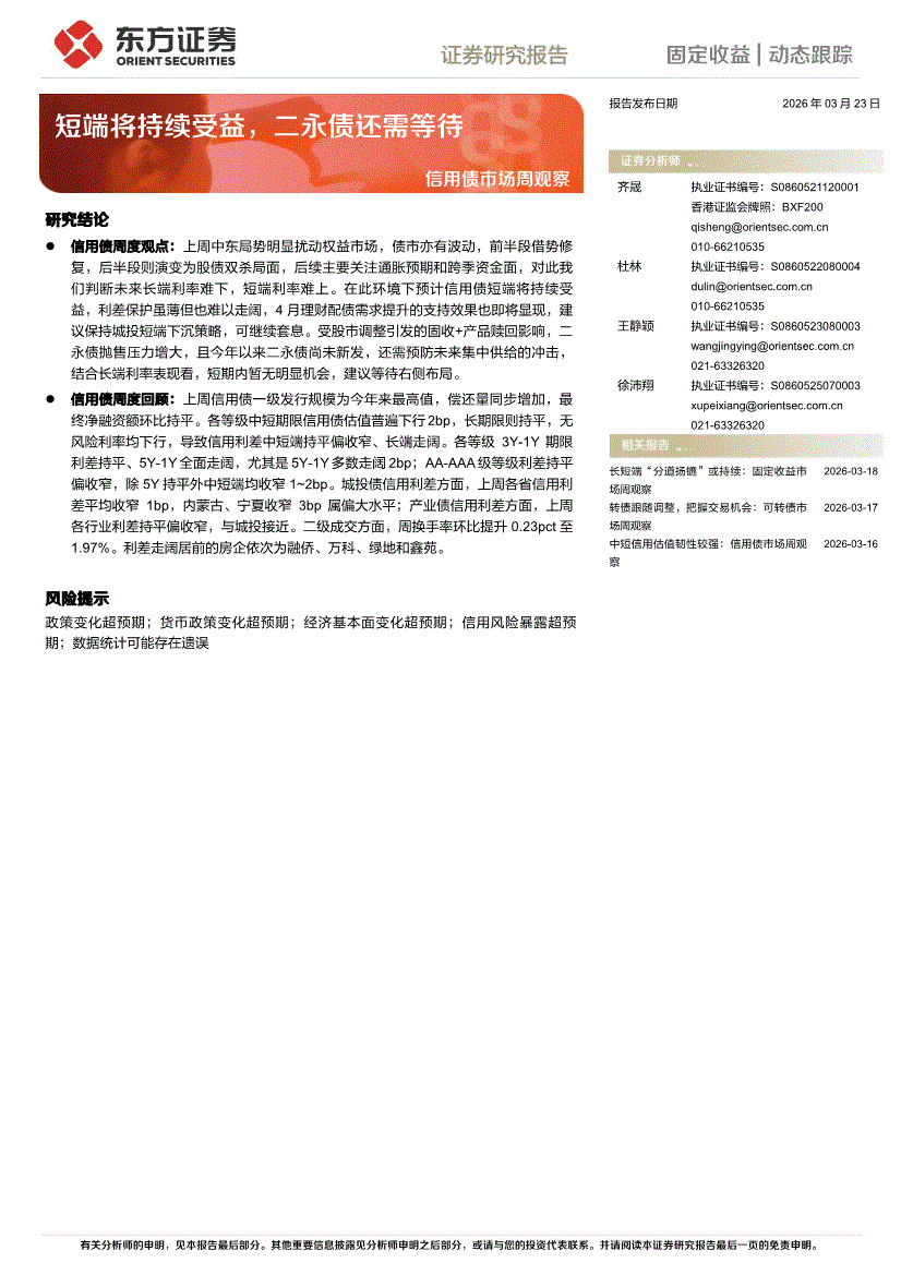 东方证券-信用债市场周观察:短端将持续受益,二永债还需等待-260323