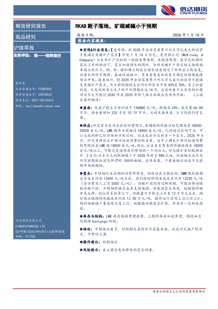 信达期货-沪镍早报:RKAB靴子落地,矿端减幅小于预期-260116