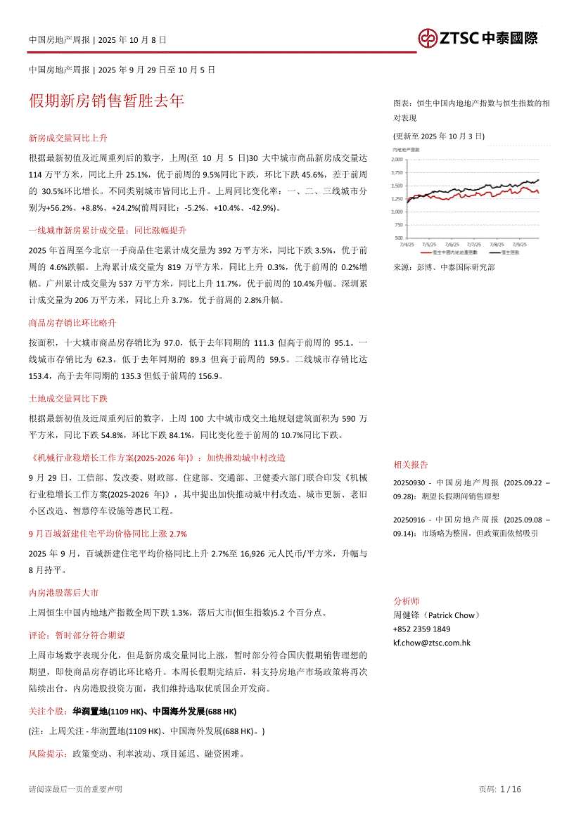 房地产行业:中泰国际-中国房地产行业周报:假期新房销售暂胜去年-251008
