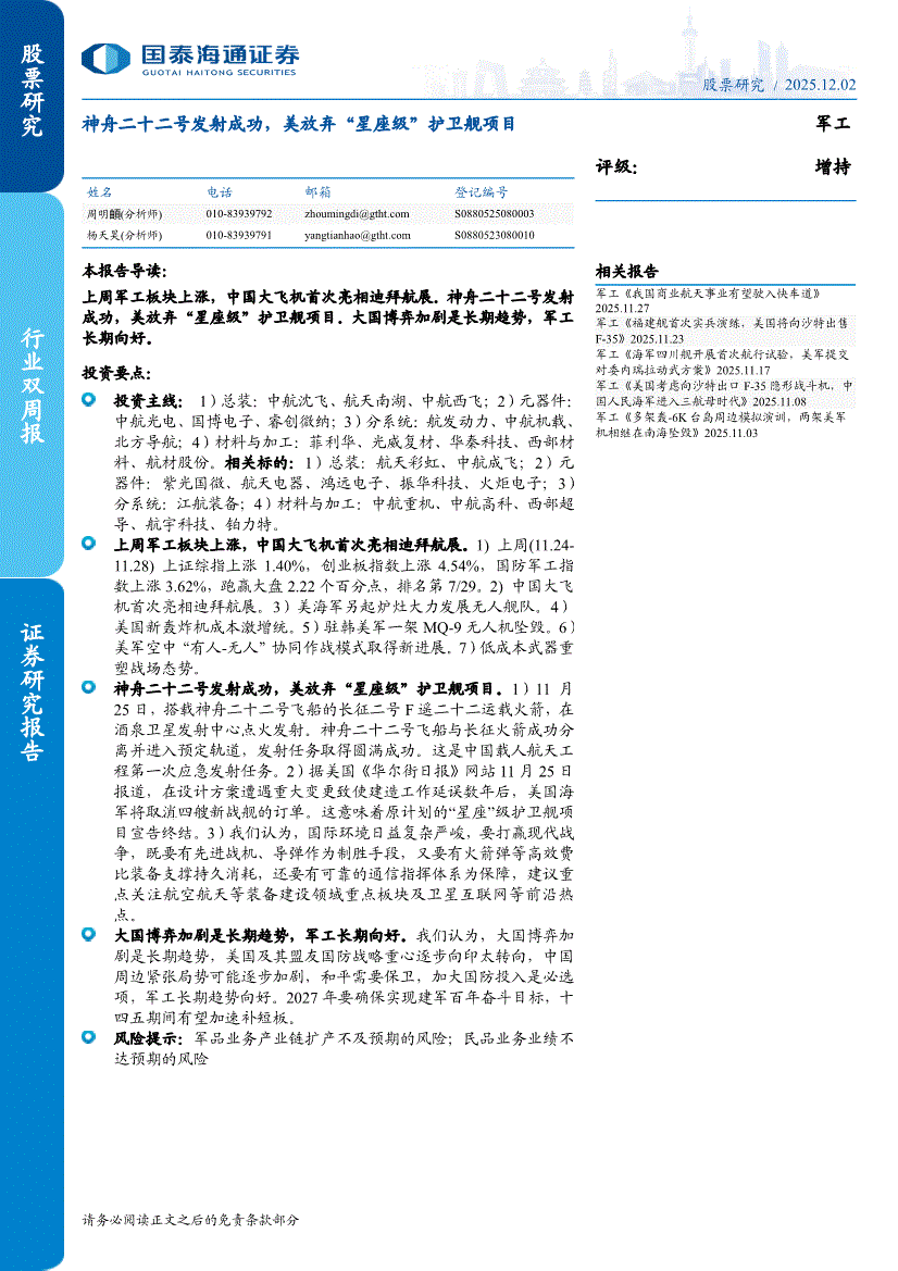 军工行业:国泰海通证券-军工行业:神舟二十二号发射成功,美放弃“星座级”护卫舰项目-251202
