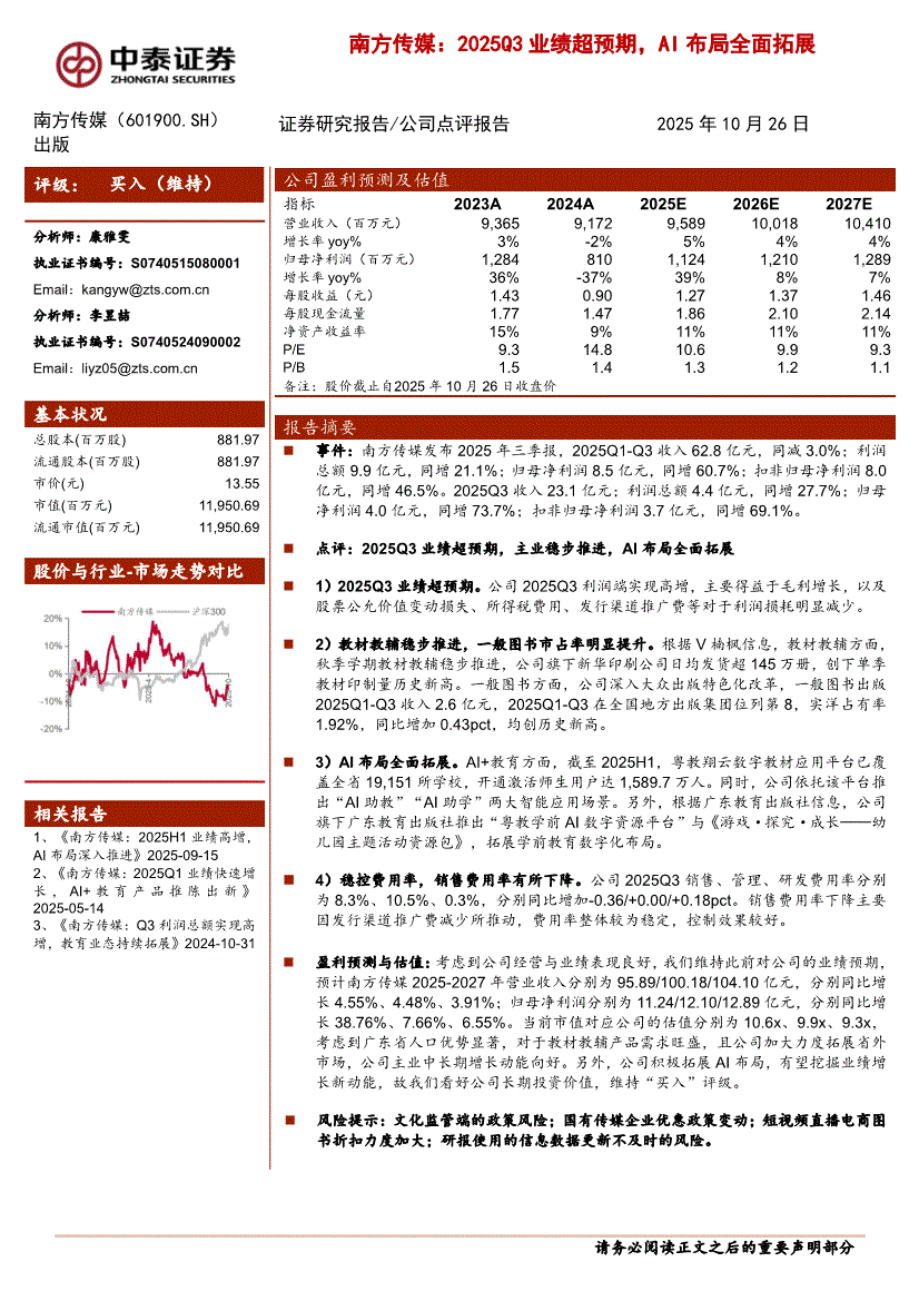 南方传媒:中泰证券-南方传媒-601900-2025Q3业绩超预期,AI布局全面拓展-251026