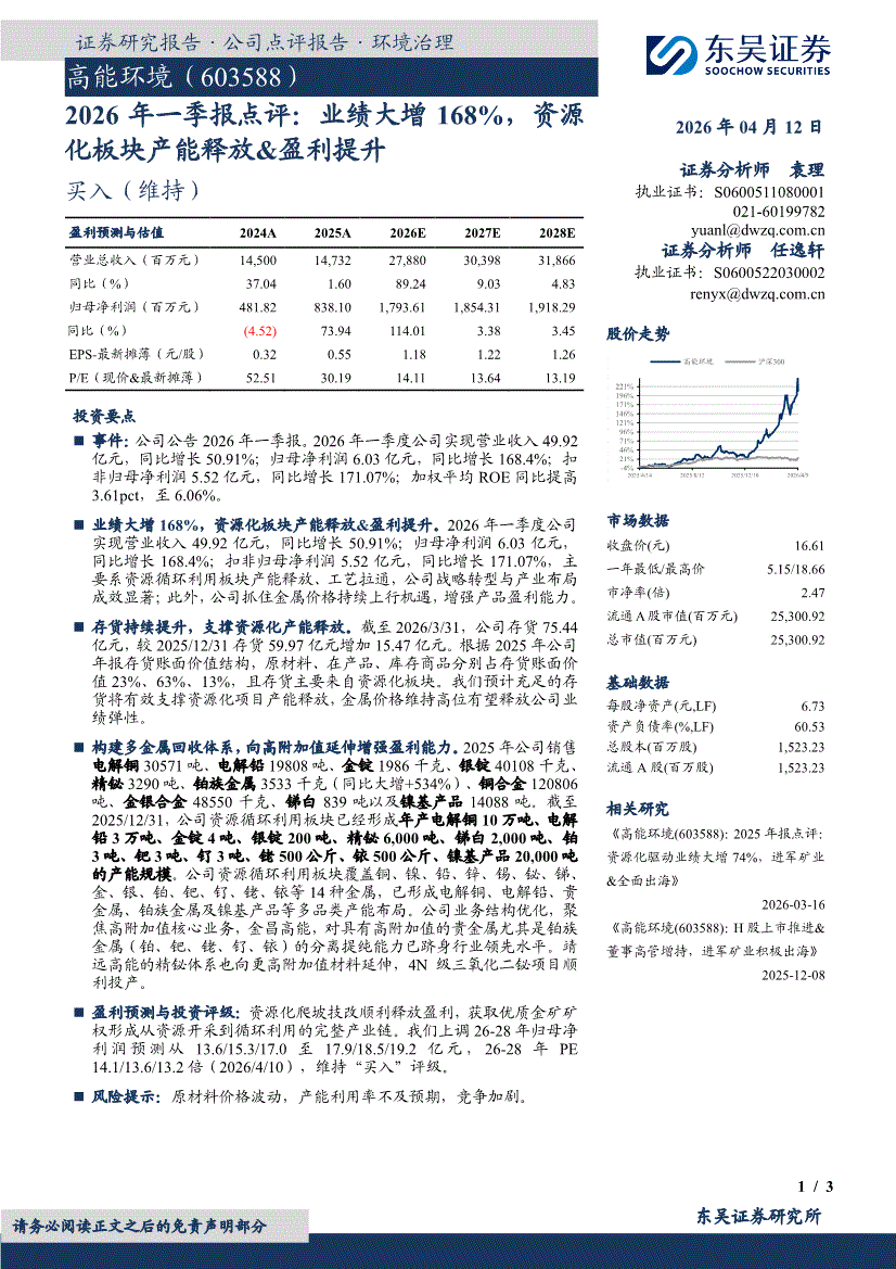 高能环境:东吴证券-高能环境-603588-2026年一季报点评:业绩大增168%,资源化板块产能释放&盈利提升-260412