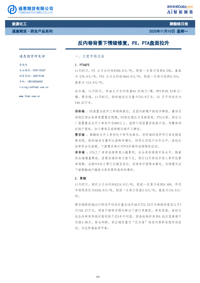 通惠期货-聚酯链日报:反内卷背景下情绪修复,PX、PTA盘面拉升-251110