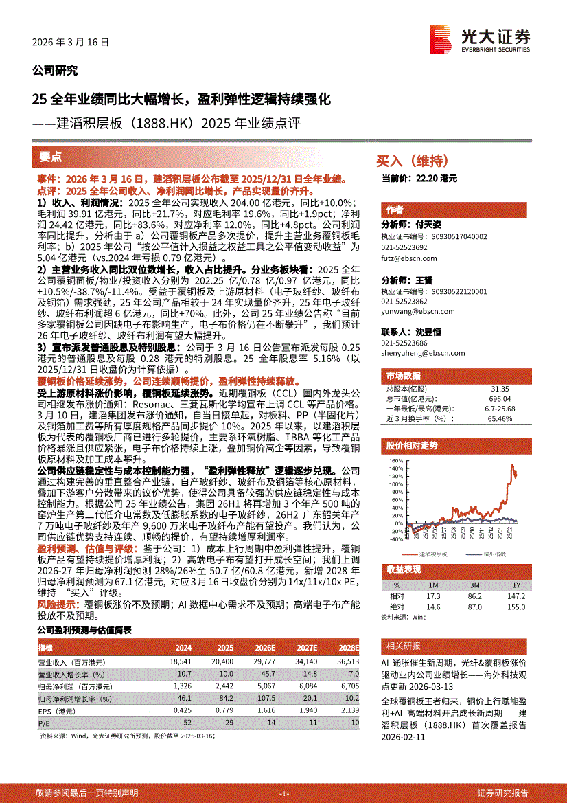 建滔积层板:光大证券-建滔积层板-1888.HK-2025年业绩点评:25全年业绩同比大幅增长,盈利弹性逻辑持续强化-260316