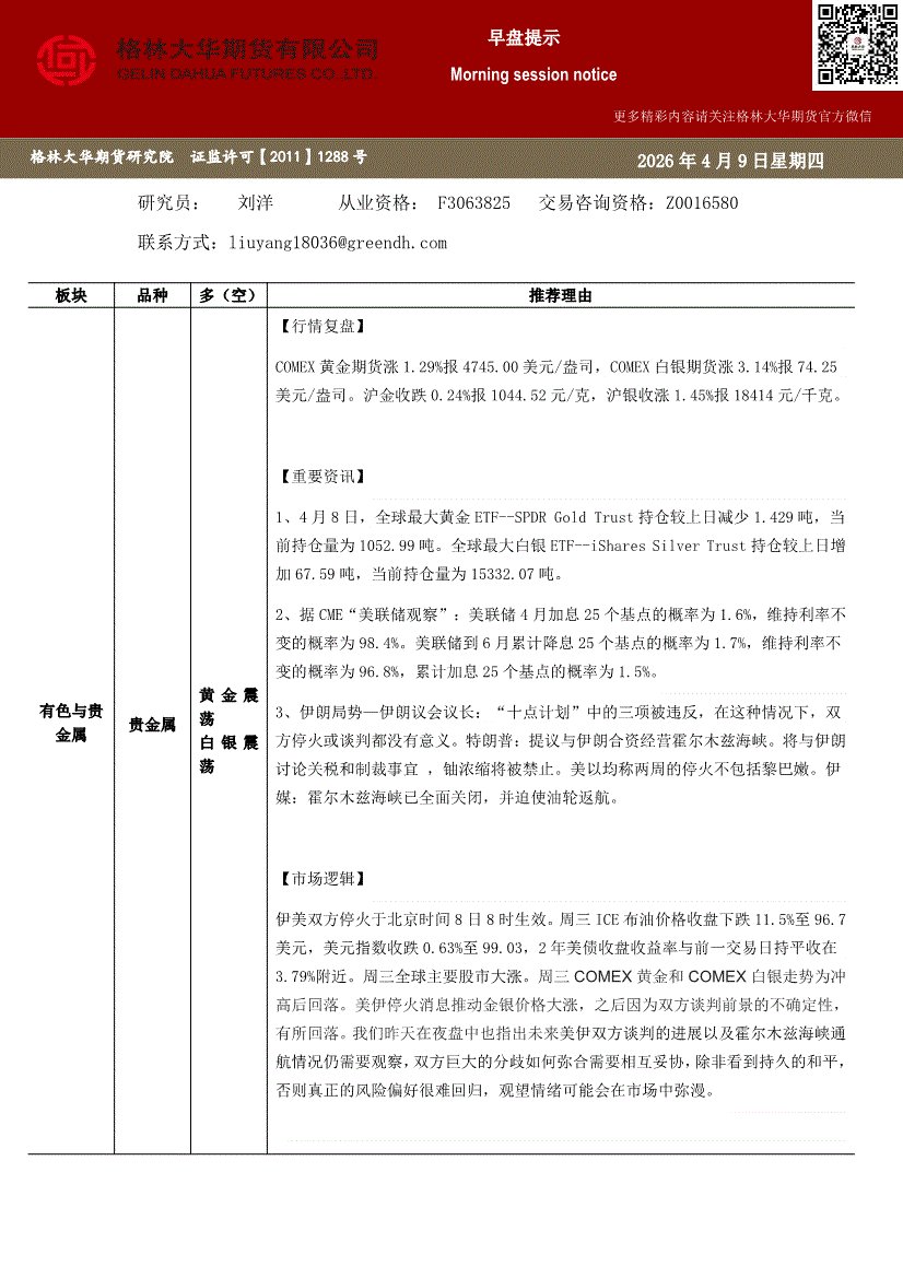 格林大华期货-早盘提示~贵金属-260409