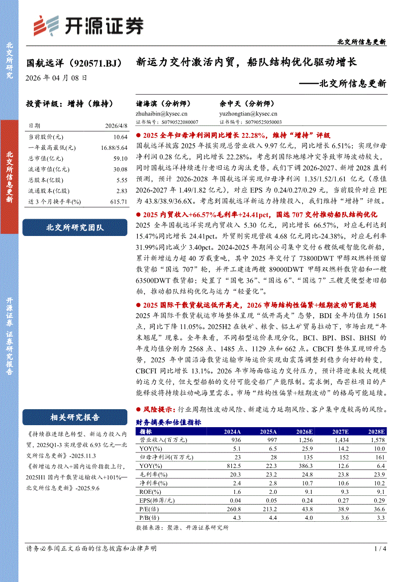 国航远洋:开源证券-国航远洋-920571-北交所信息更新:新运力交付激活内贸,船队结构优化驱动增长-260408