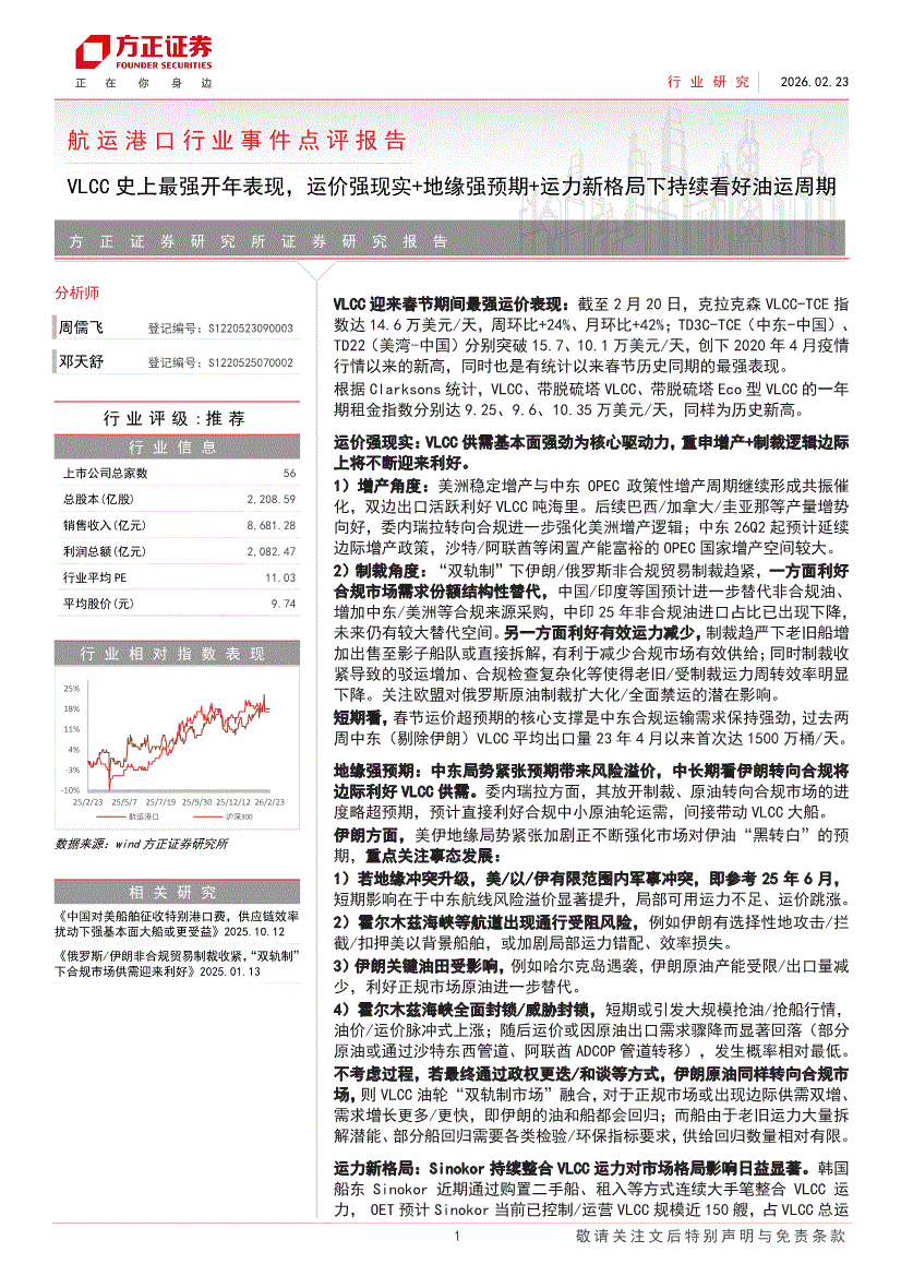 航运港口行业:方正证券-航运港口行业事件点评报告:VLCC史上最强开年表现,运价强现实+地缘强预期+运力新格局下持续看好油运周期-260223