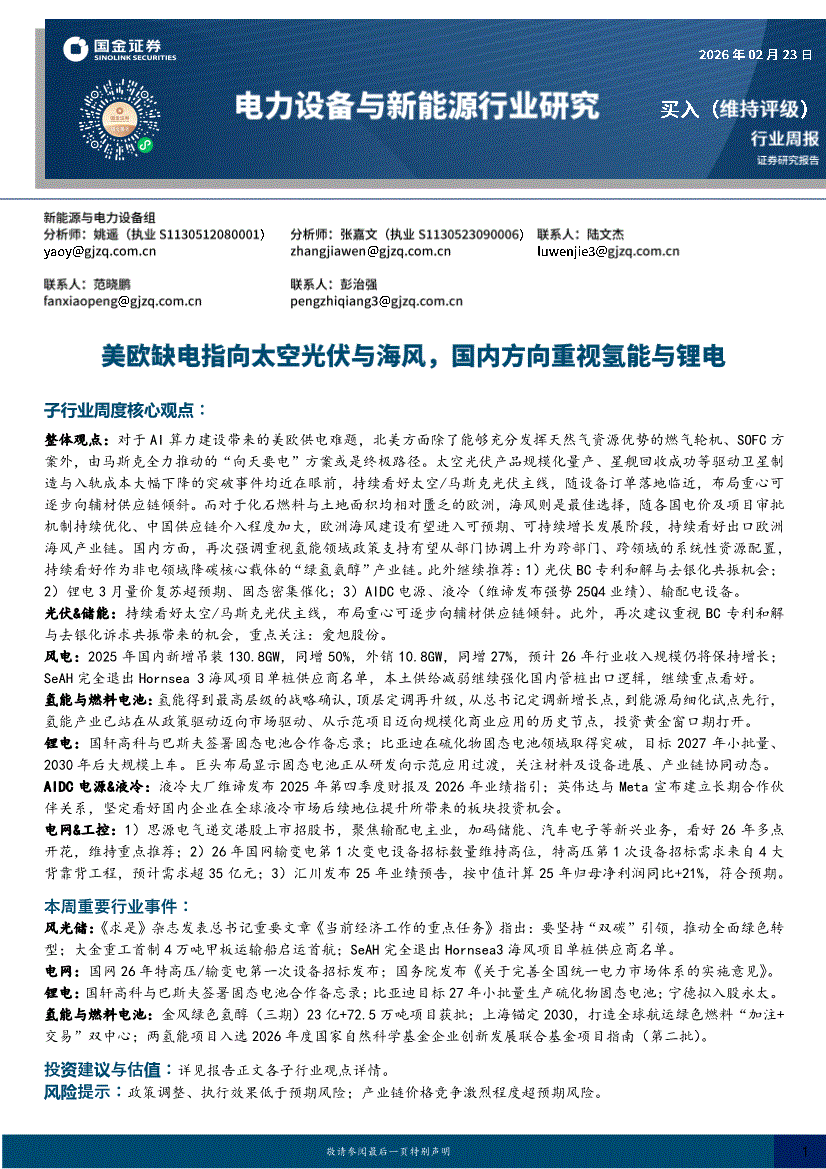电力设备与新能源行业:国金证券-电力设备与新能源行业周报:美欧缺电指向太空光伏与海风,国内方向重视氢能与锂电-260223