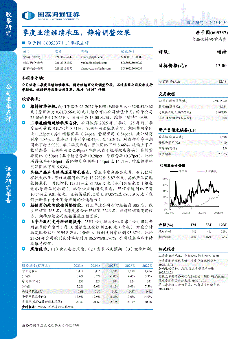 李子园:国泰海通证券-李子园-605337-三季报点评:季度业绩继续承压,静待调整效果-251030