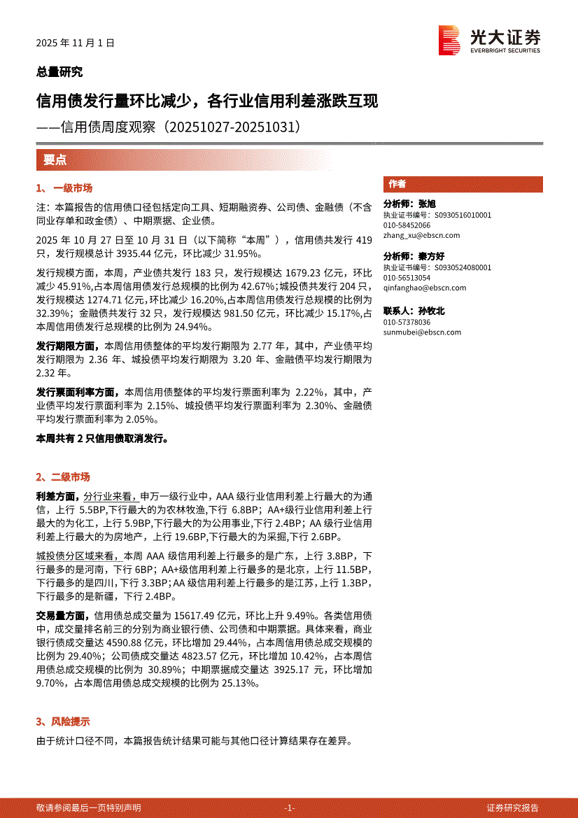 光大证券-信用债周度观察:信用债发行量环比减少,各行业信用利差涨跌互现-251101