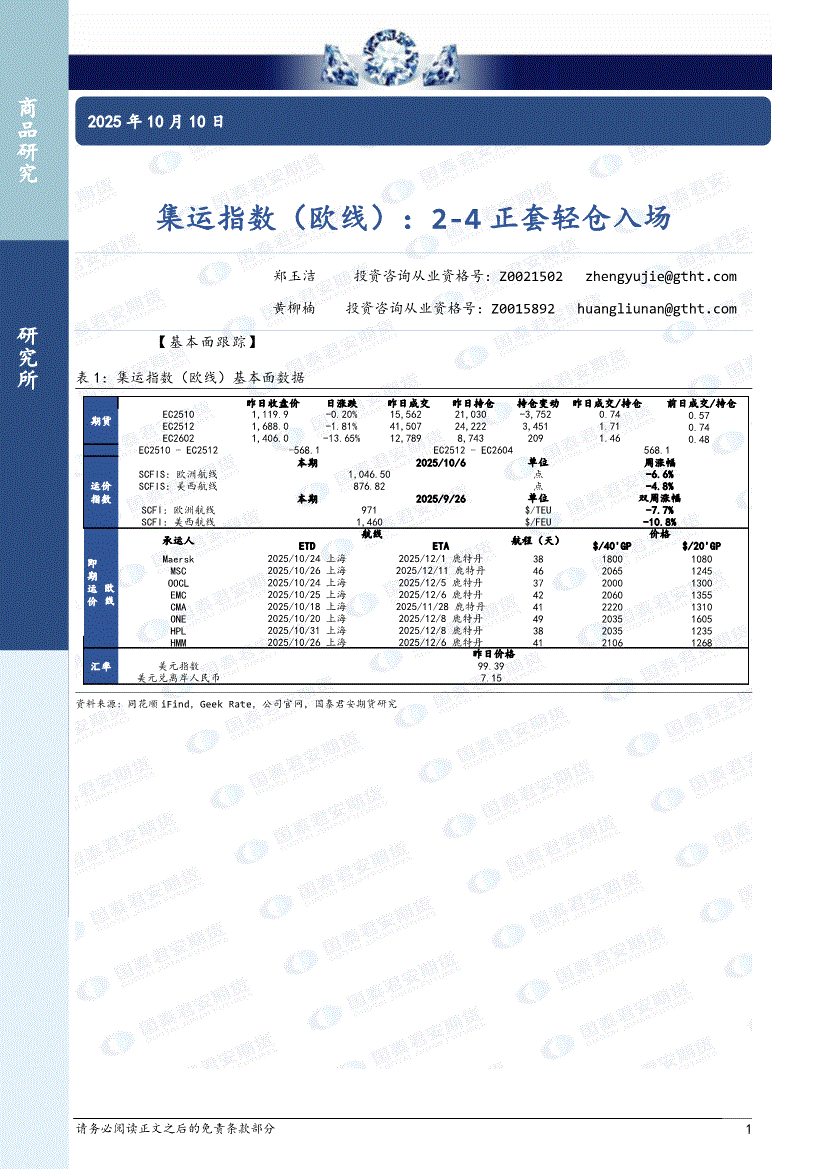 国泰君安期货-集运指数(欧线):2~4正套轻仓入场-251010
