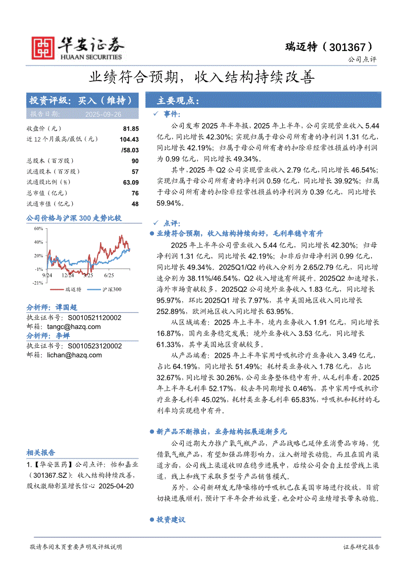 瑞迈特:华安证券-瑞迈特-301367-业绩符合预期,收入结构持续改善-250926