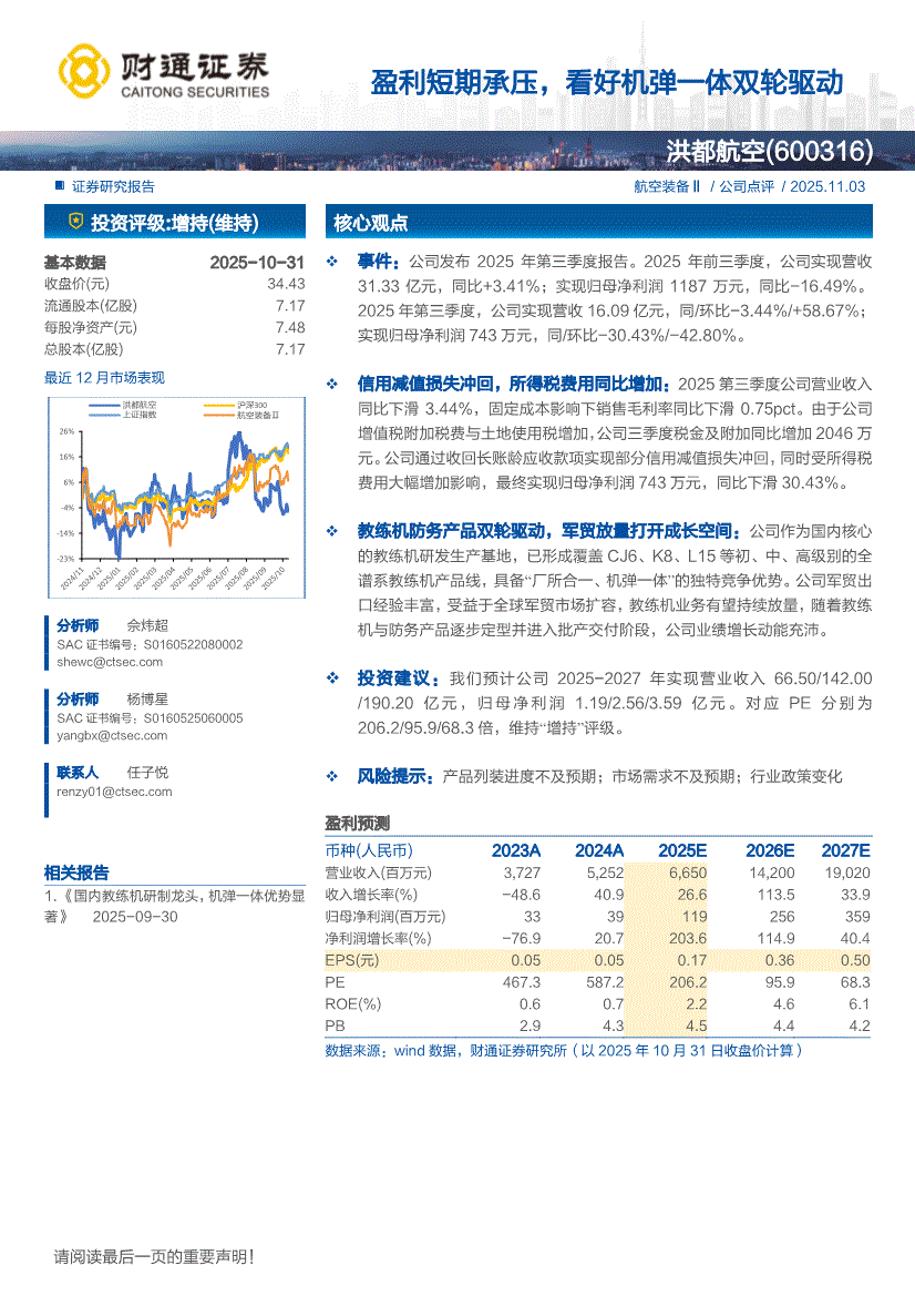 洪都航空:财通证券-洪都航空-600316-盈利短期承压,看好机弹一体双轮驱动-251103